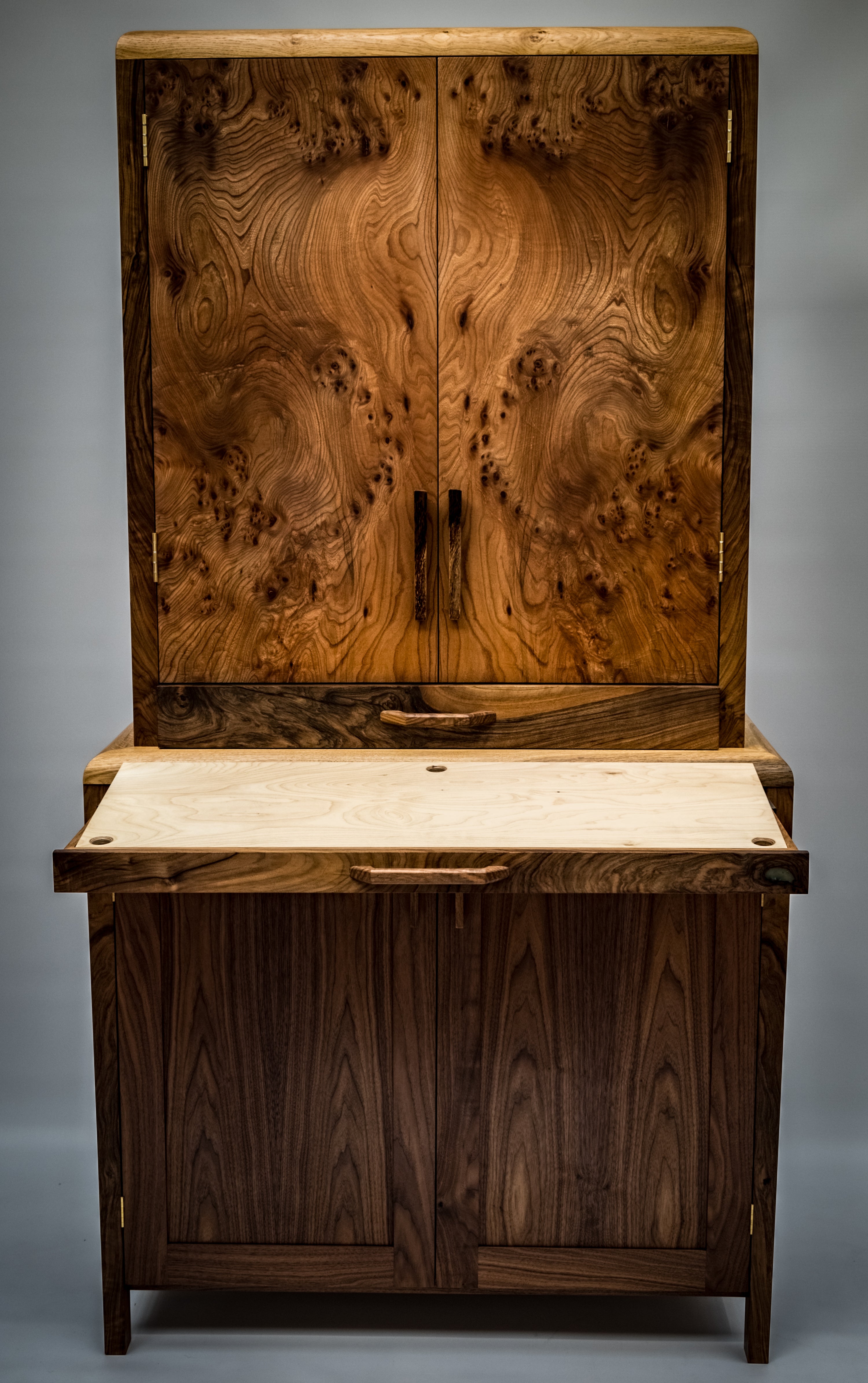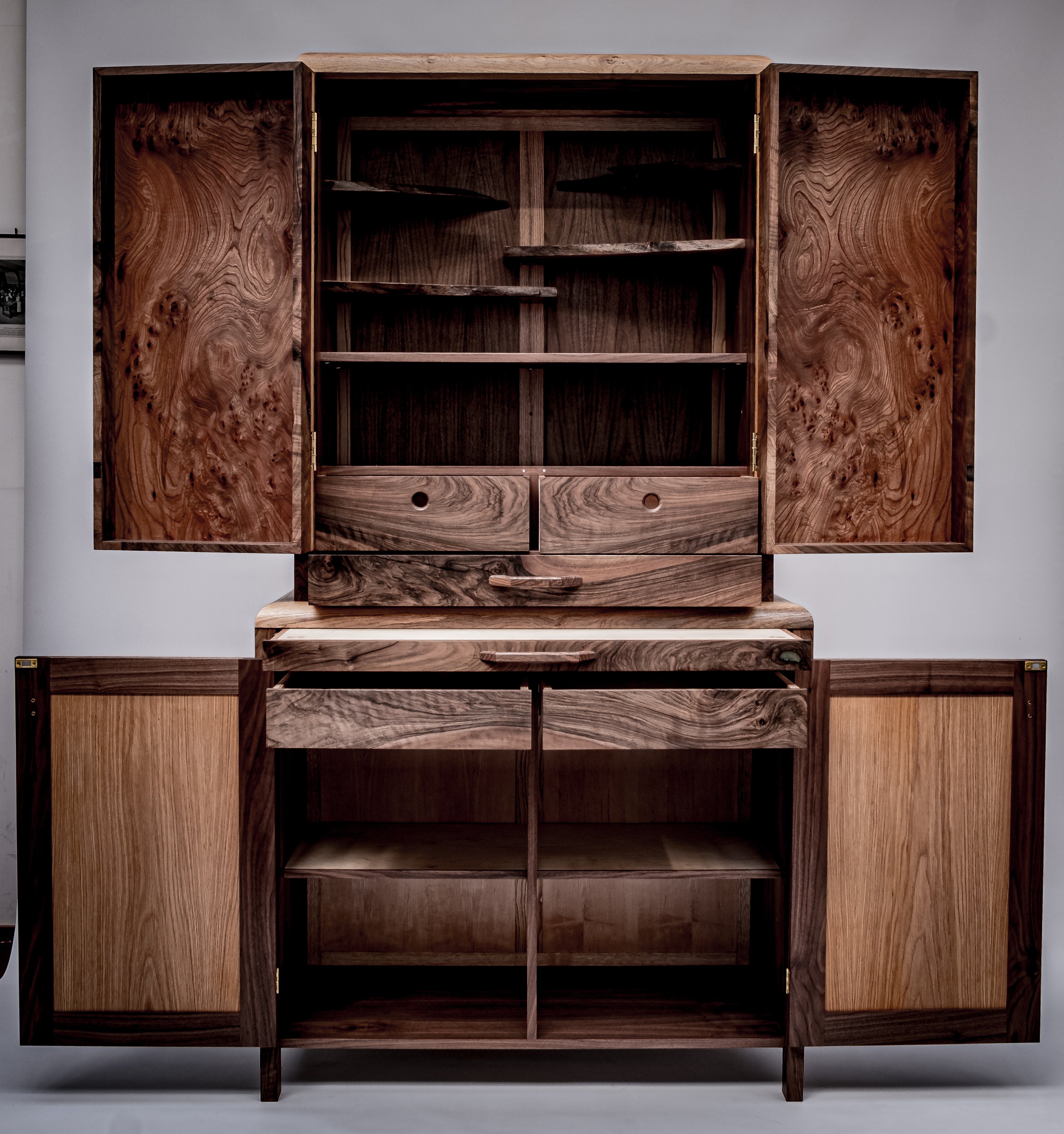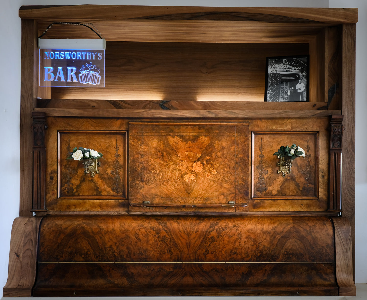 The Piano Bar drinks cabinet features not only amazing Walnut Burl, but also integrated lighting that illuminates the shelves and creates a warm and inviting atmosphere. The lighting highlights the unique features of the wood and adds a touch of elegance to the cabinet which is situated in an alcove, as a focal point to the living space.