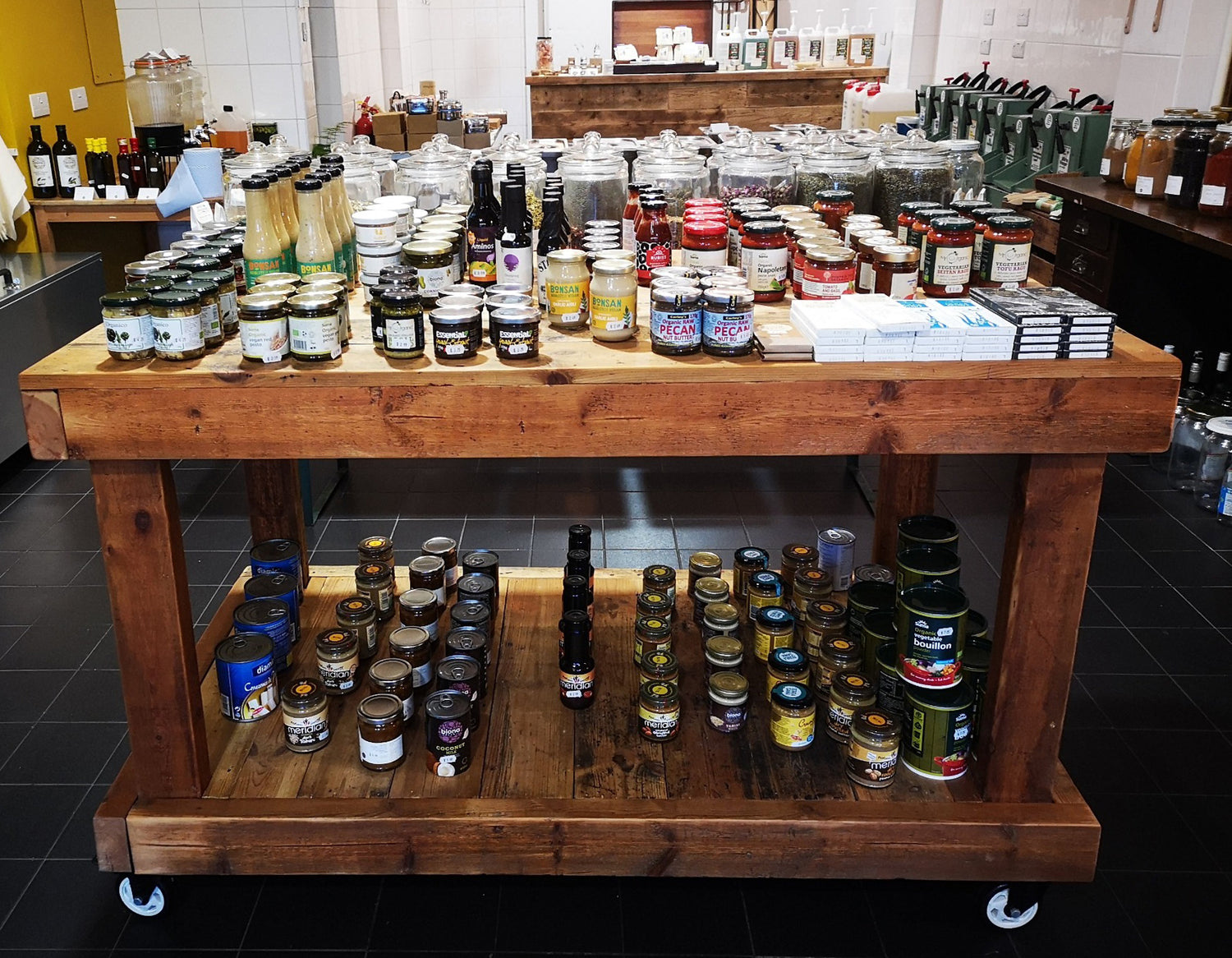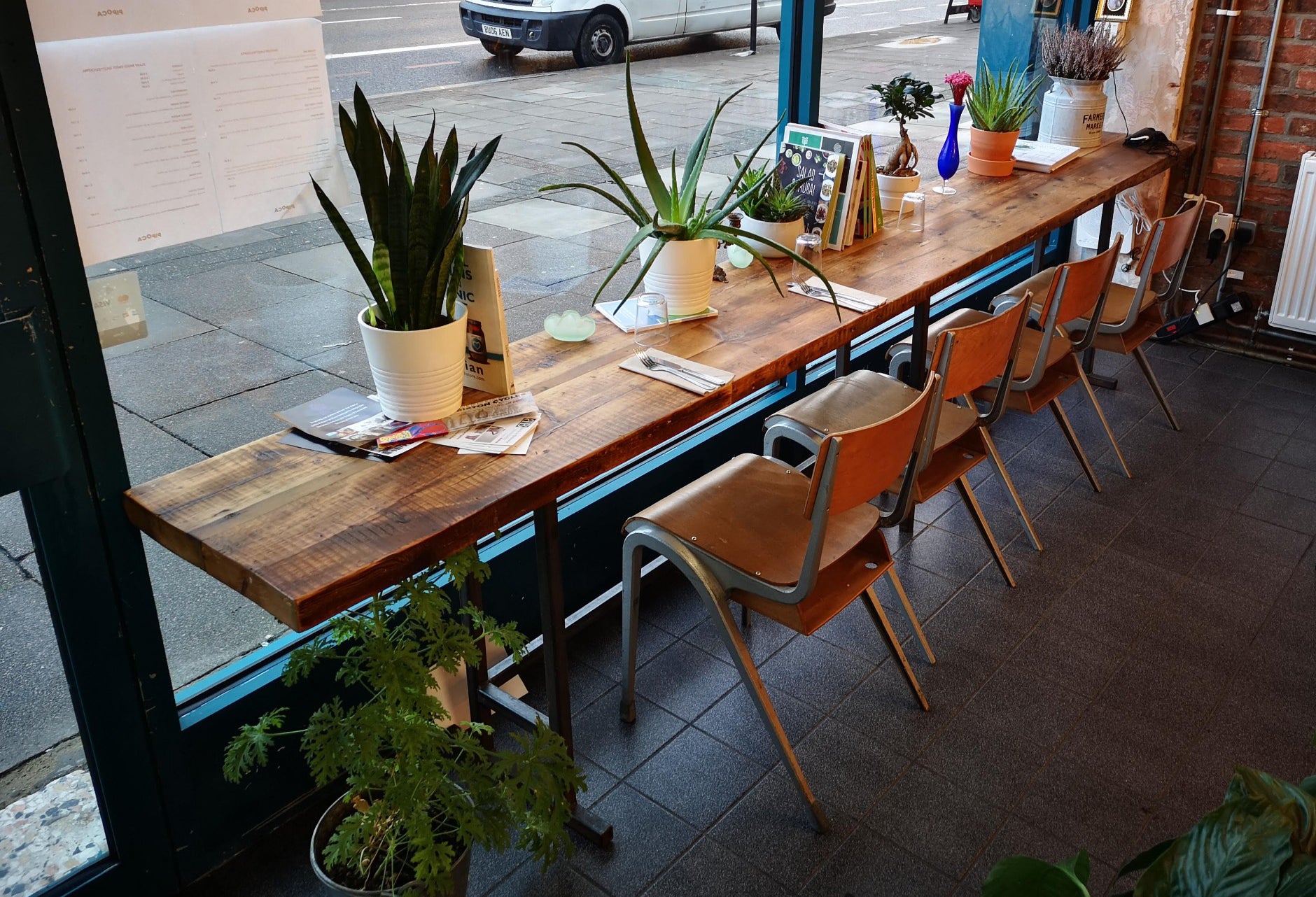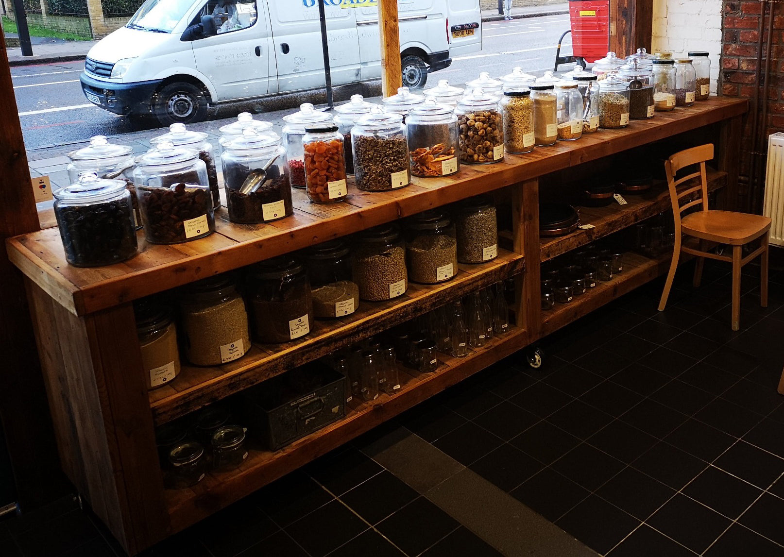 Live Edge was commissioned to design and create bespoke reclaimed shop furniture and a refill station for Pipoca Vegan in Brixton, London. The project was completed in June 2018. The focus of the project was on sustainability and eco-friendliness, in line with the restaurant's ethos.