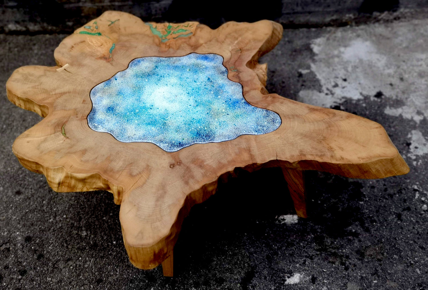 The Stella Star Stable coffee table is a stunning piece of furniture, designed with a natural edge and an art glass top. This unique table was created through a partnership between Live Edge and glass artist Roberta De Caro, resulting in a one-of-a-kind piece.