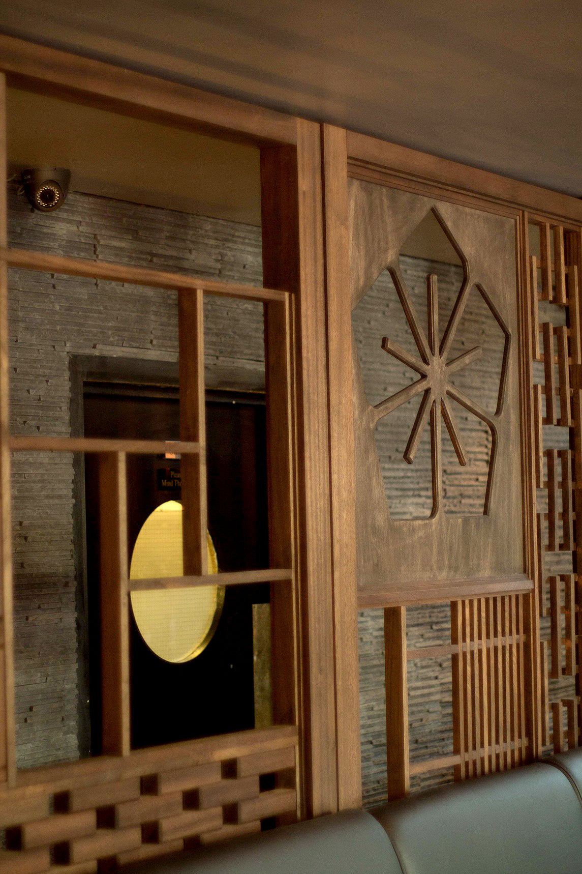 Tsunami Japanese restaurant is in Clapham, London and boasts hard wood Japanese style partition screens as its key feature. Live Edge was commissioned to design and fabricate ten intricate screens that would not only create a decorative partition between the logistics of the restaurant, but also add an atmosphere of intrigue and glamour. Inspiration was drawn from various sources, including Japanese architecture and Shinto temples. Each panel was meticulously crafted using intricate fretwork techniques, complemented with gold leafing to enhance the luxurious ambiance of Tsunami.