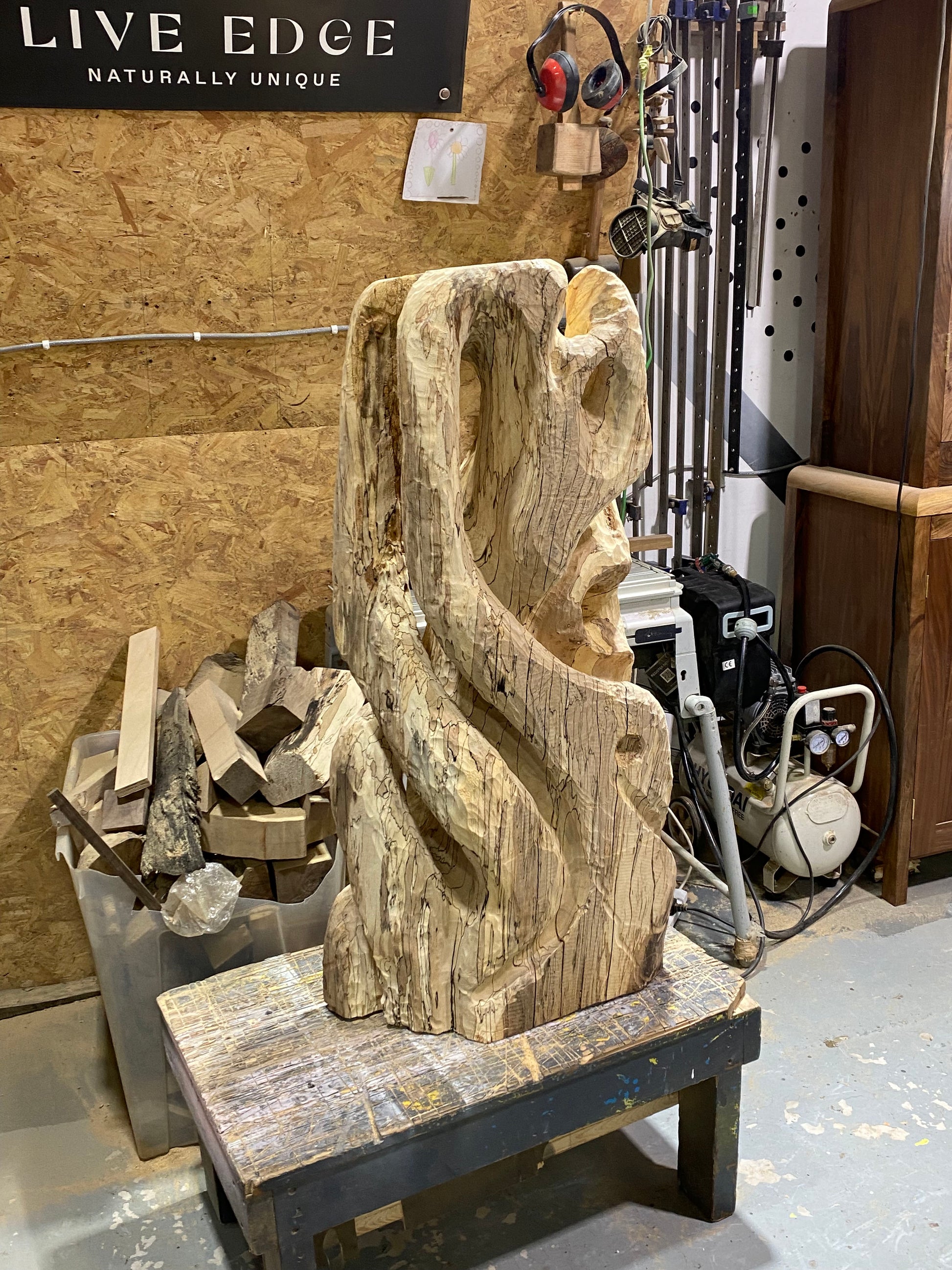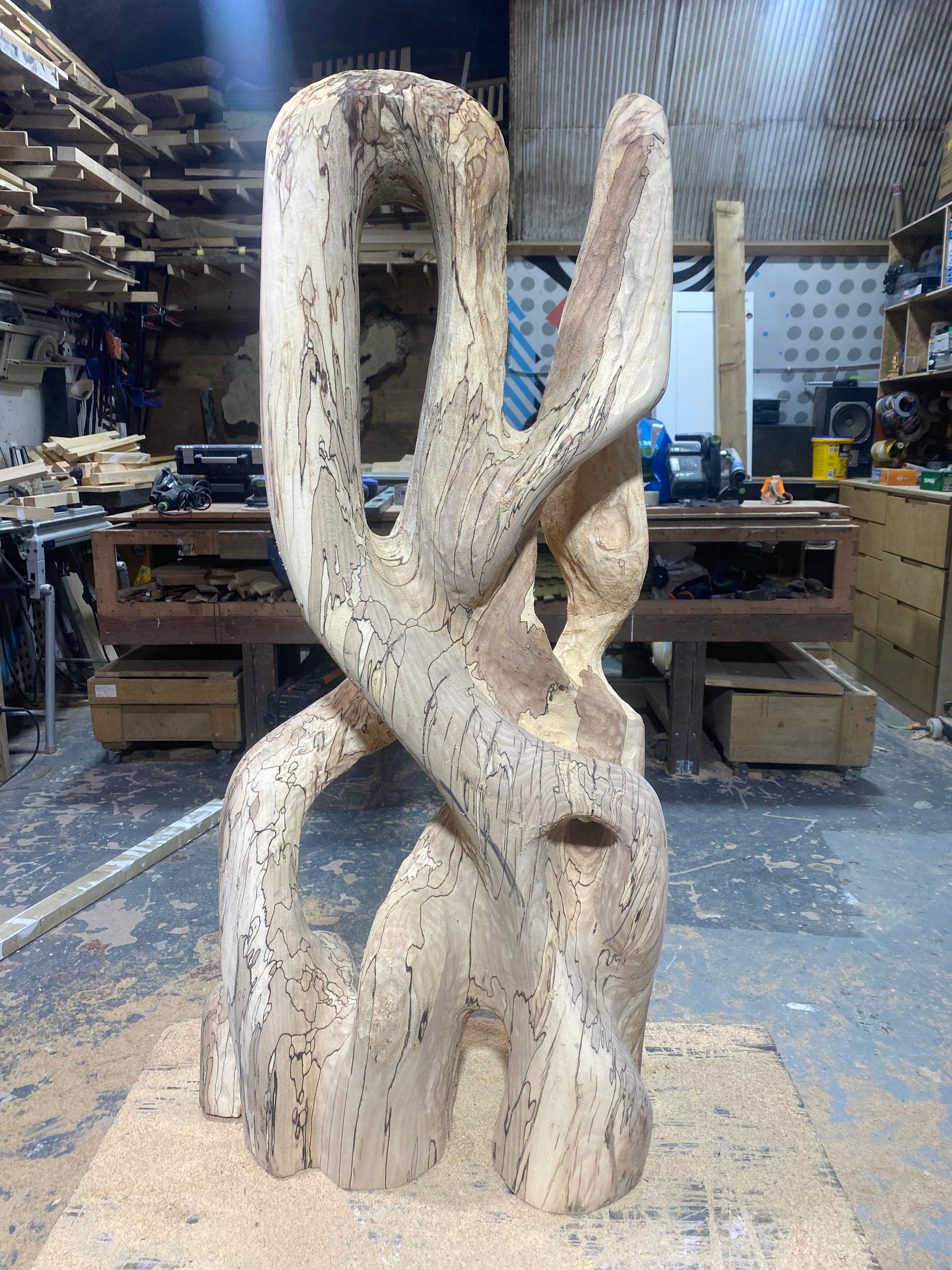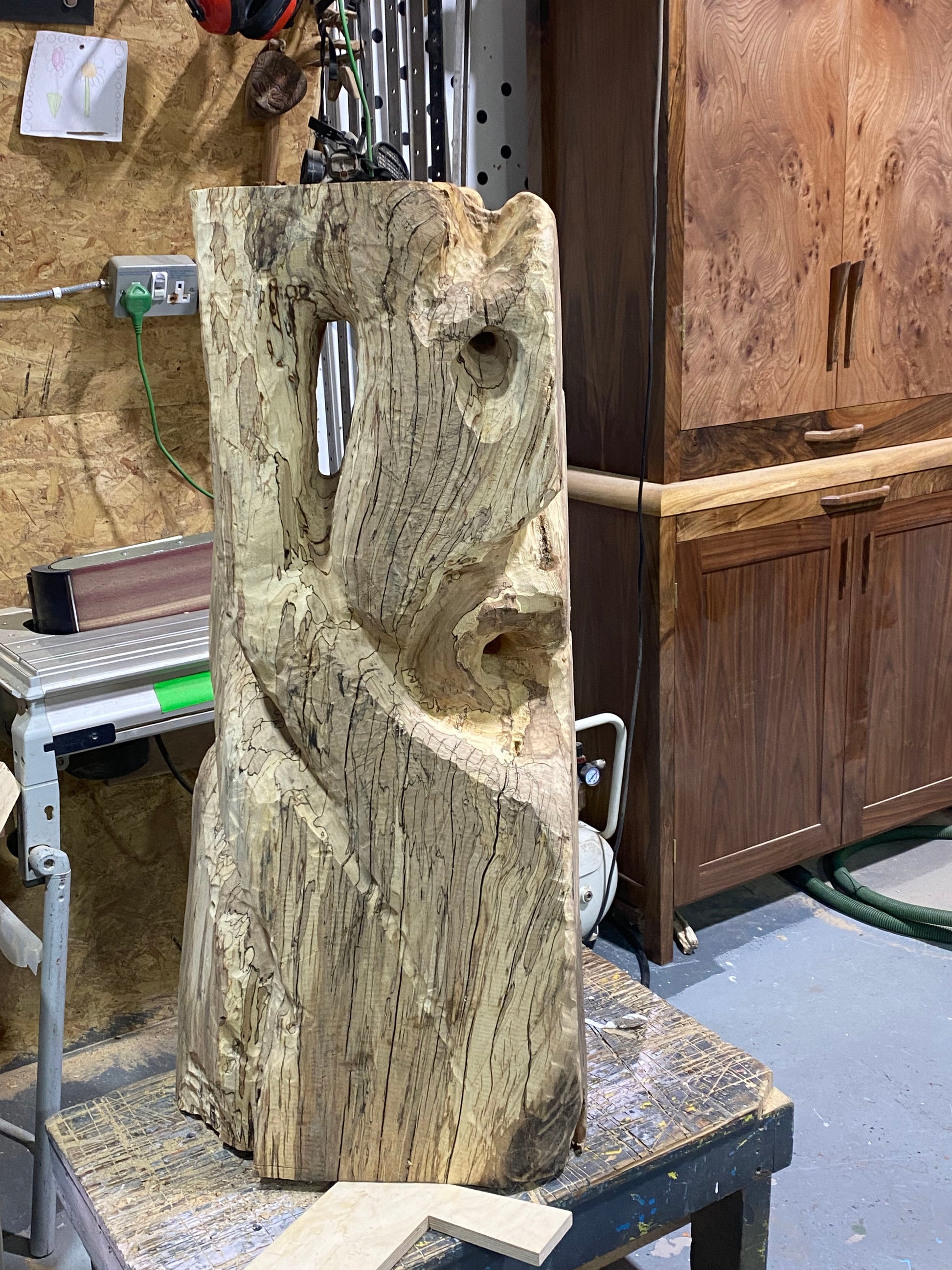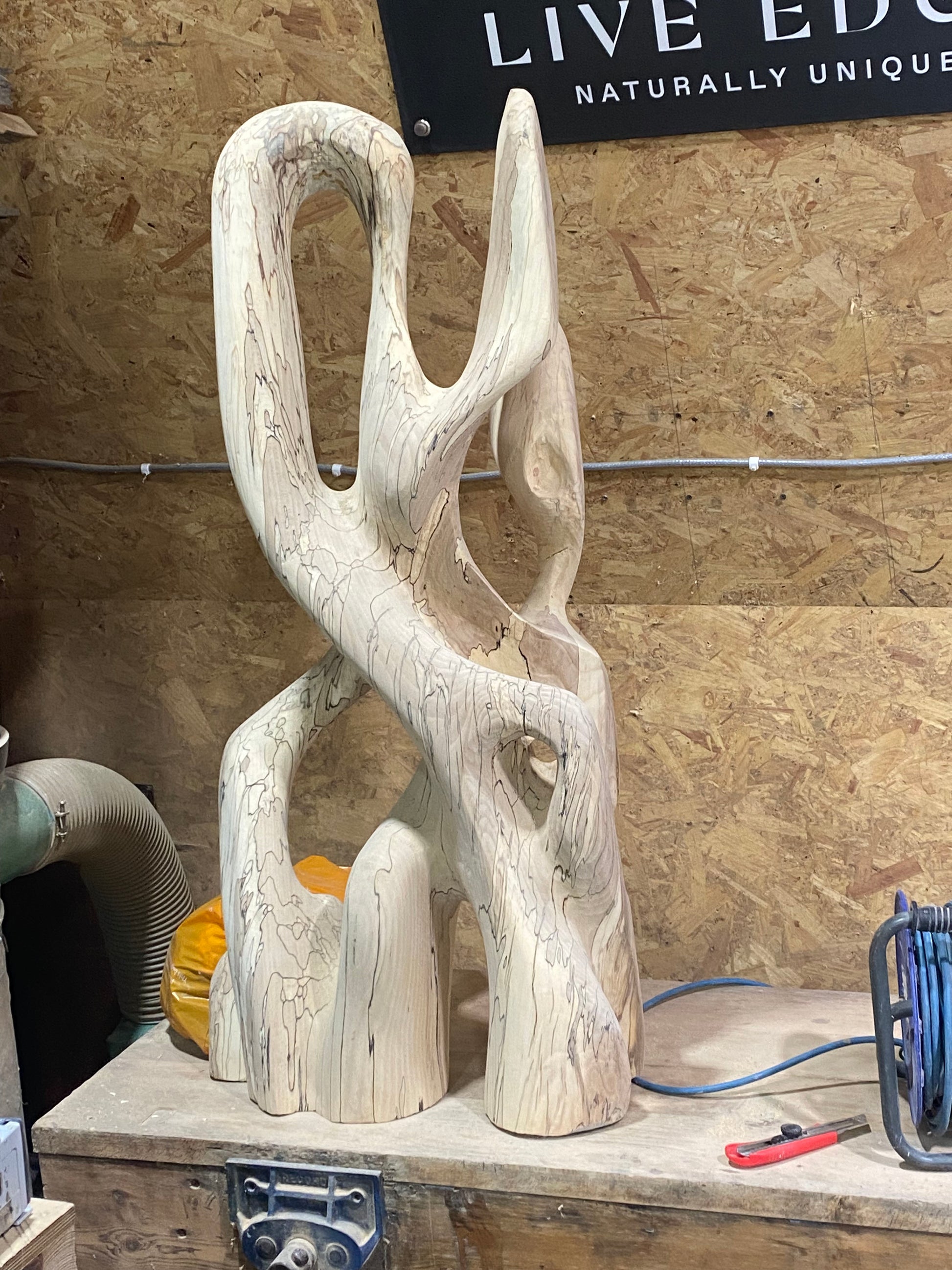 This is a unique piece carved from a large slab of Spalted Beech, positioned on a Black Walnut plinth.