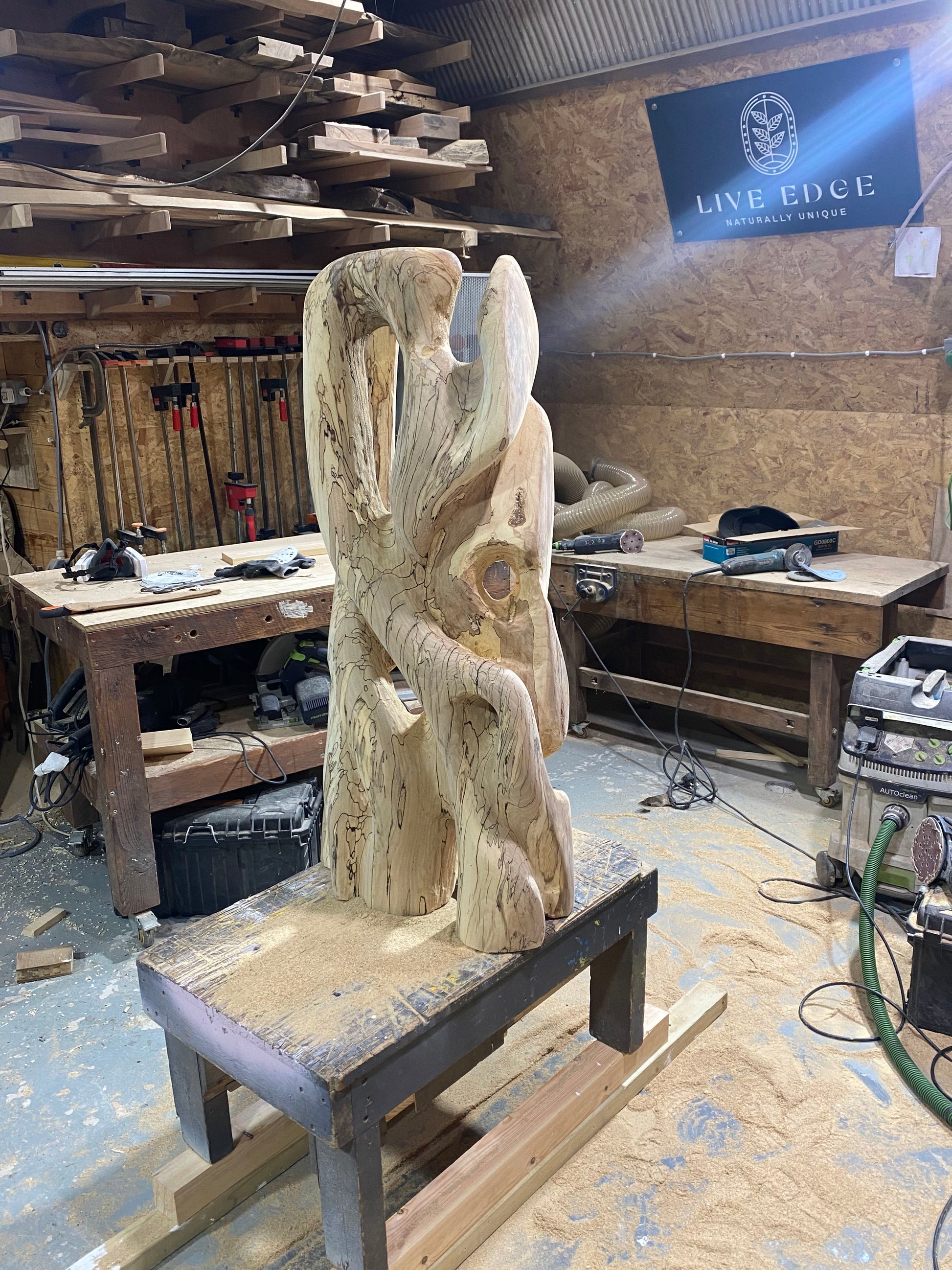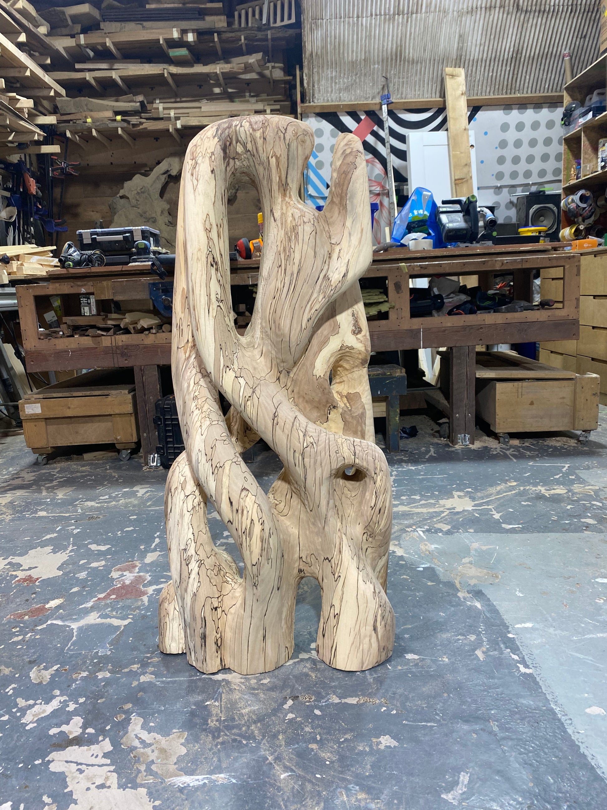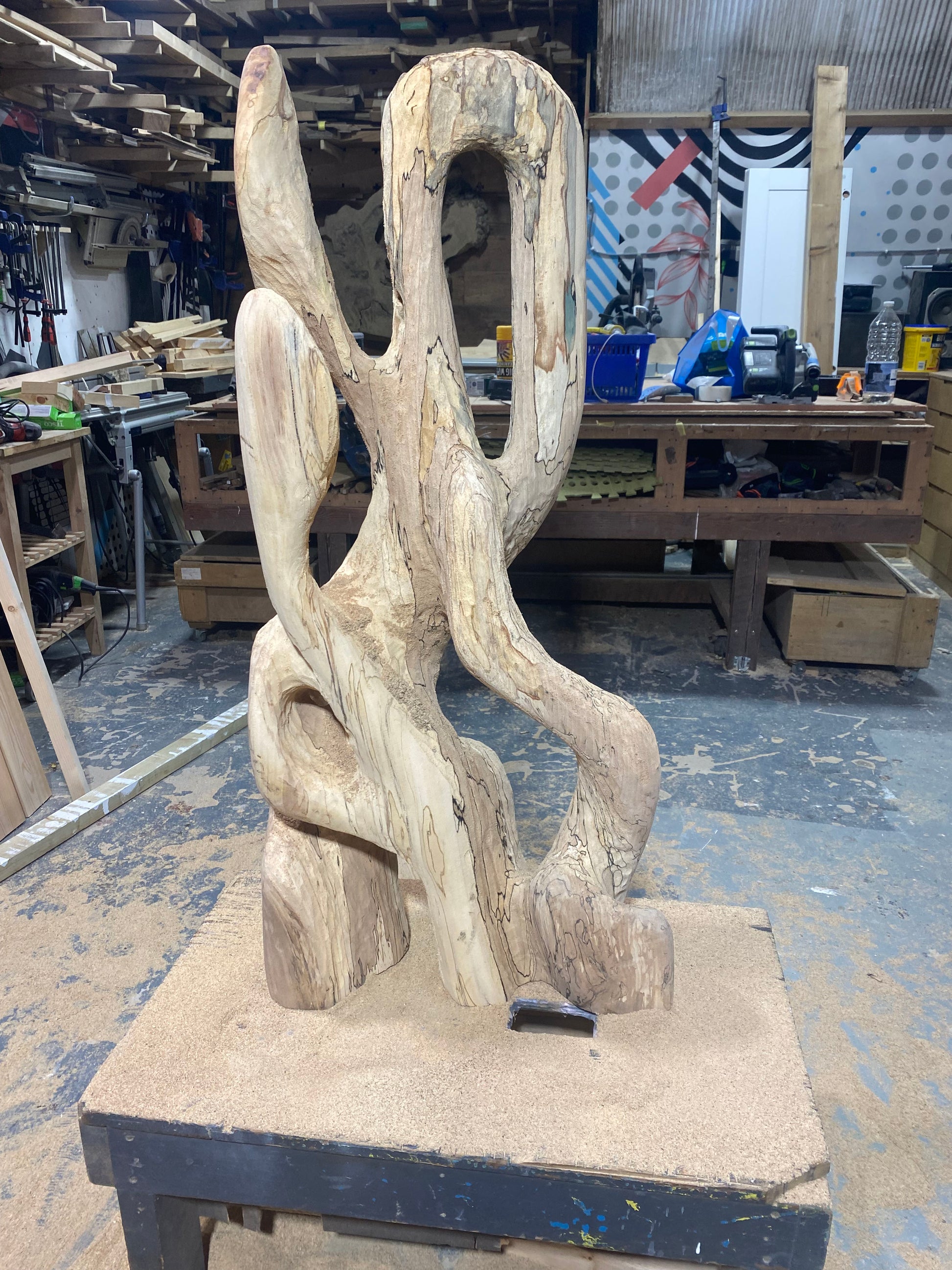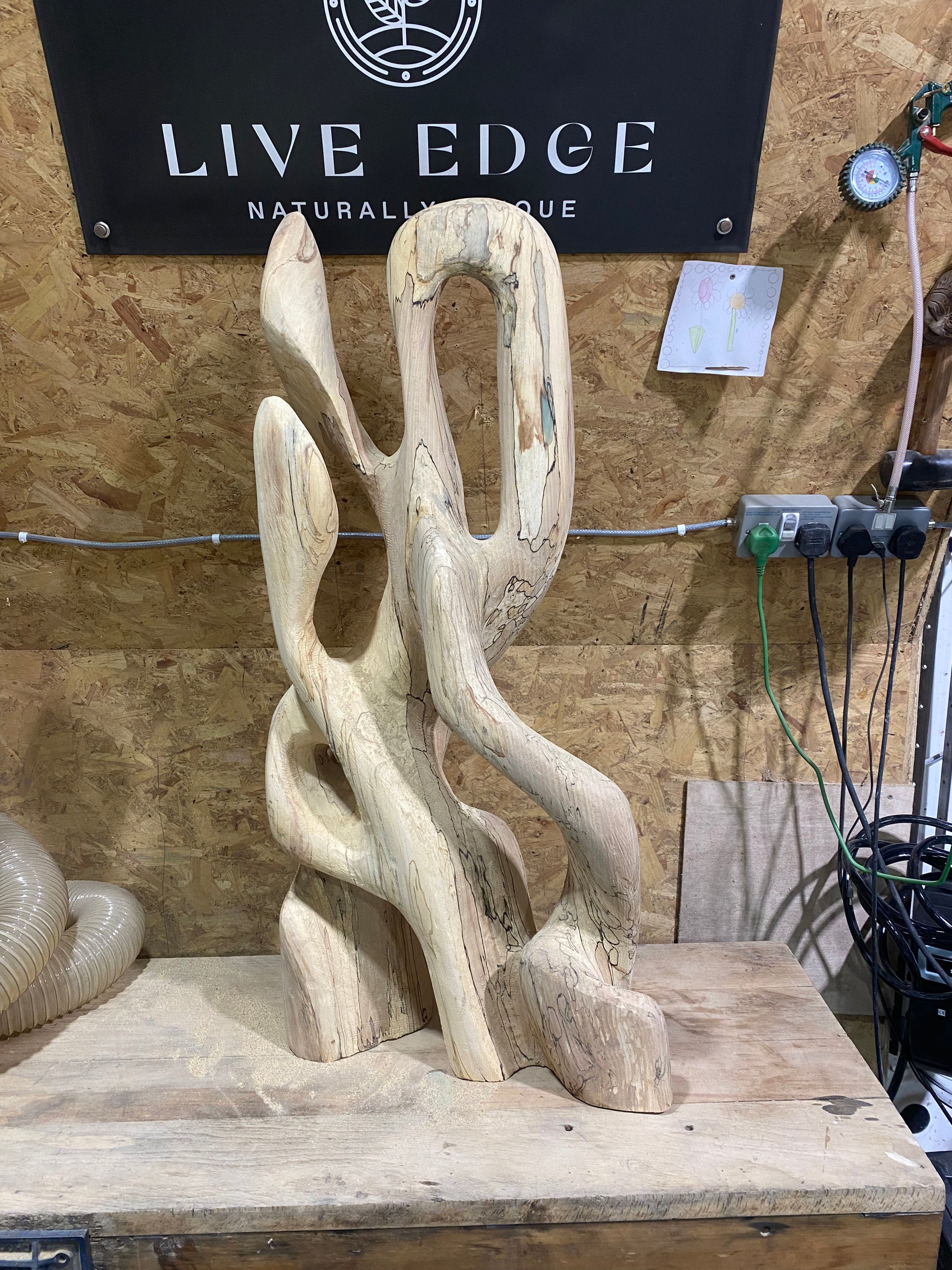 This is a unique piece carved from a large slab of Spalted Beech, positioned on a Black Walnut plinth.