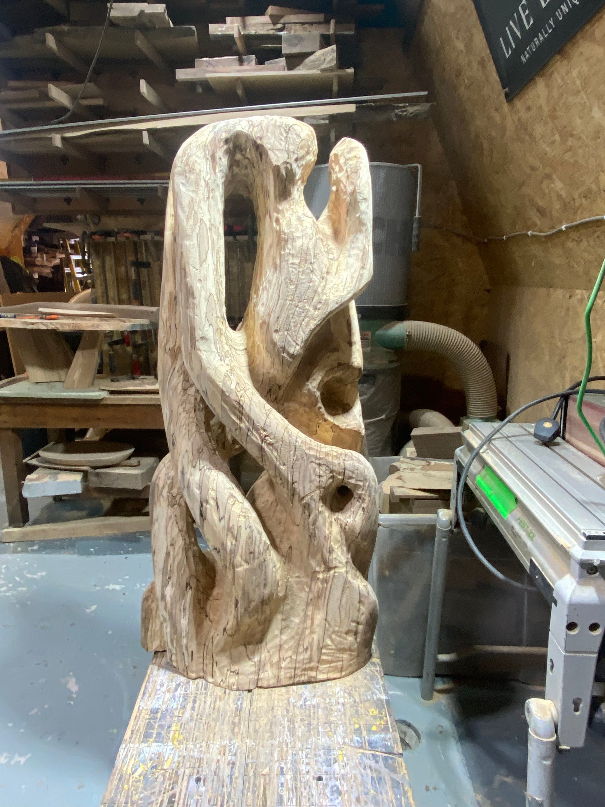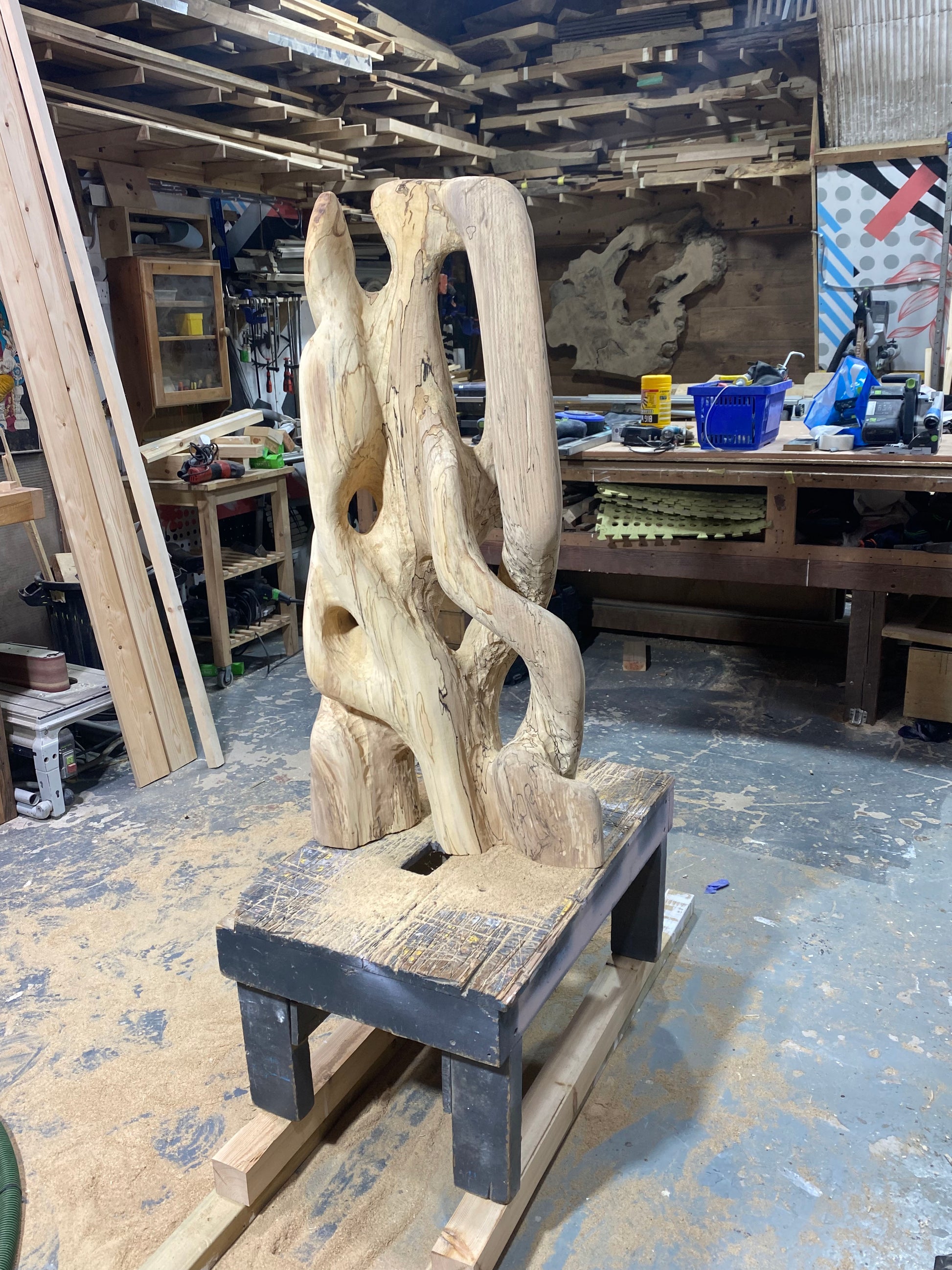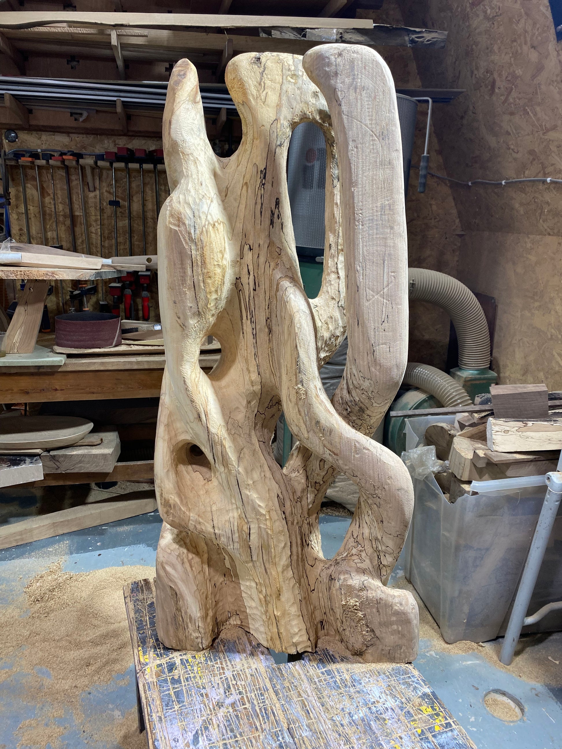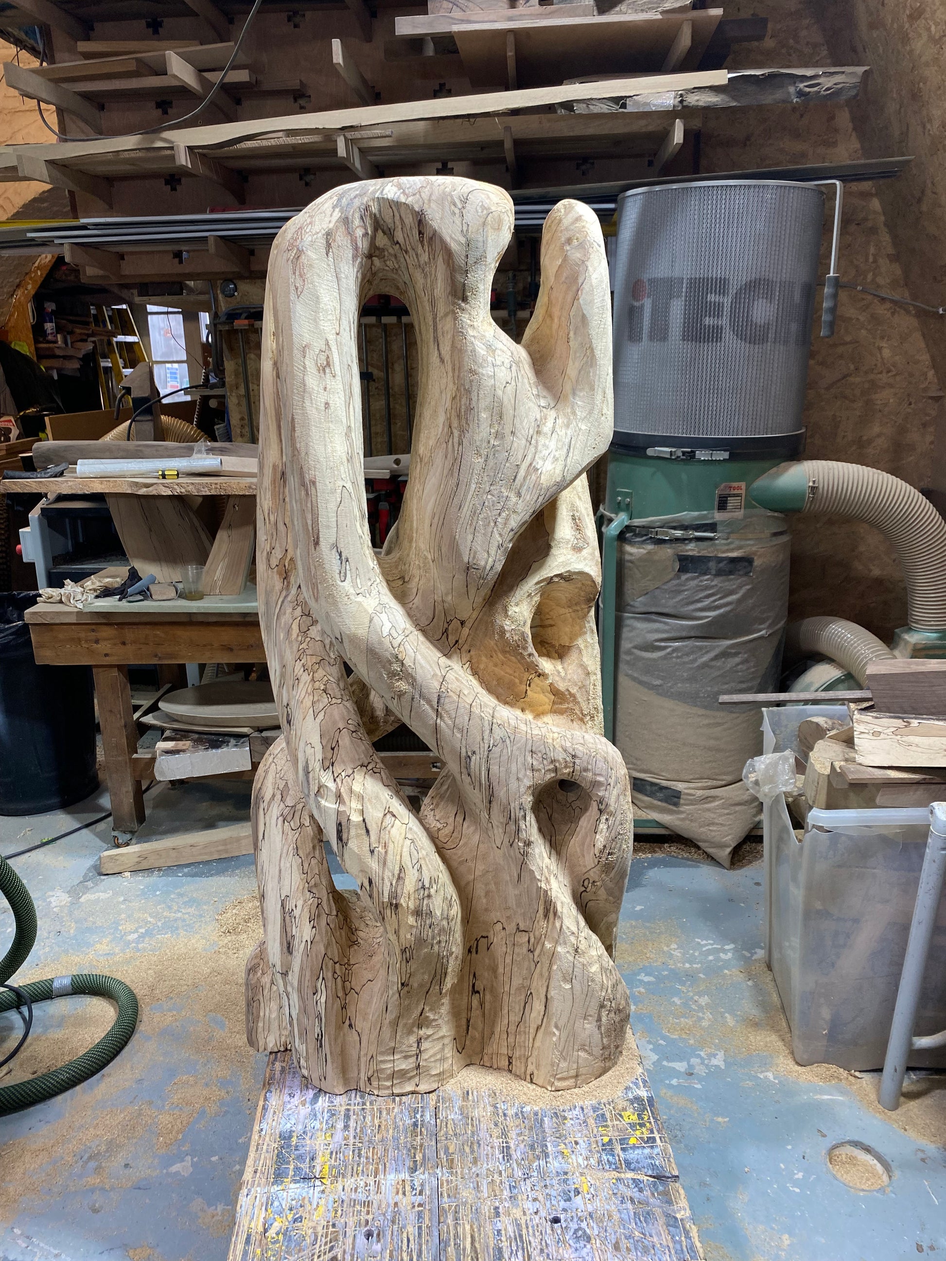 This is a unique piece carved from a large slab of Spalted Beech, positioned on a Black Walnut plinth.