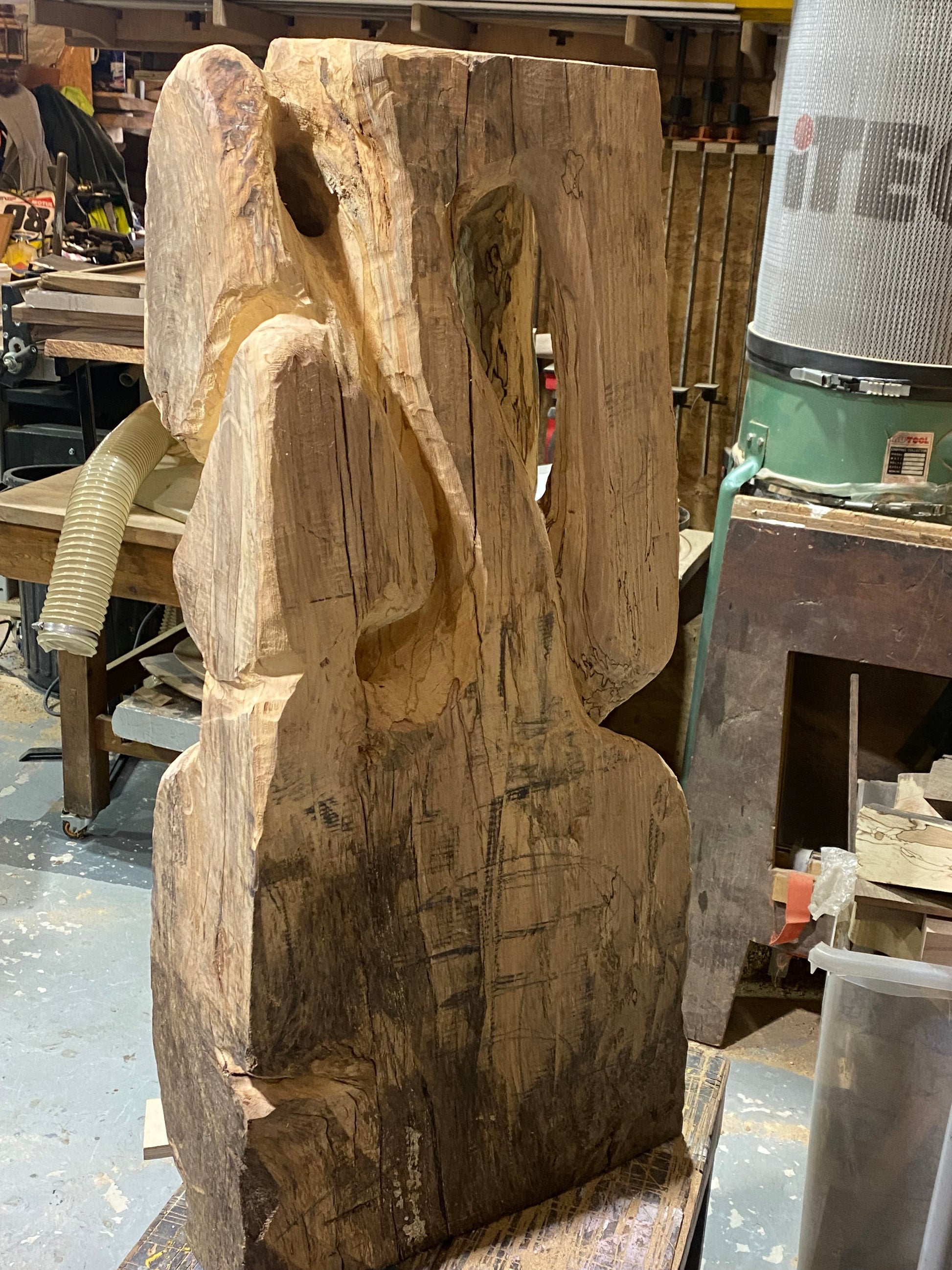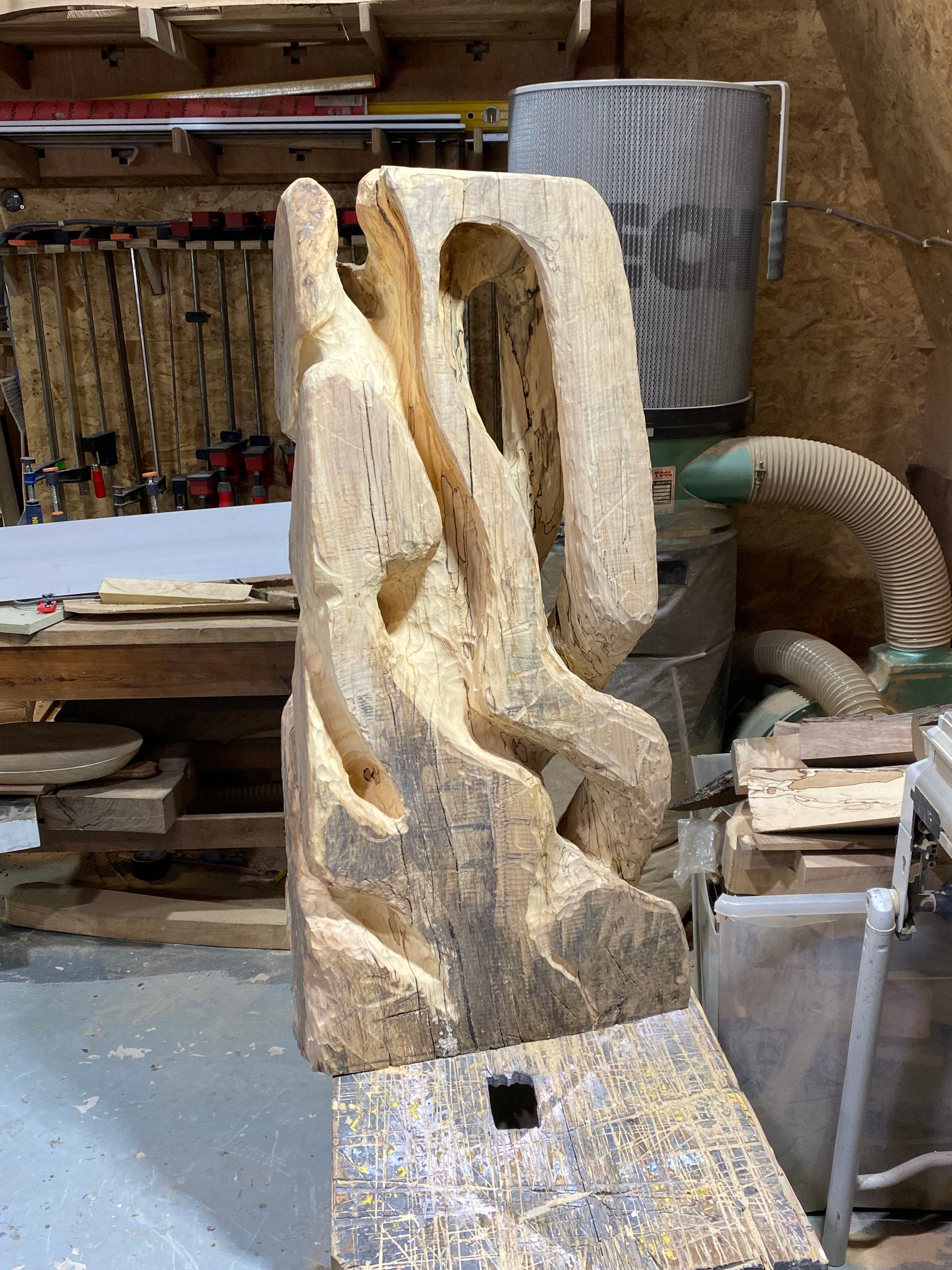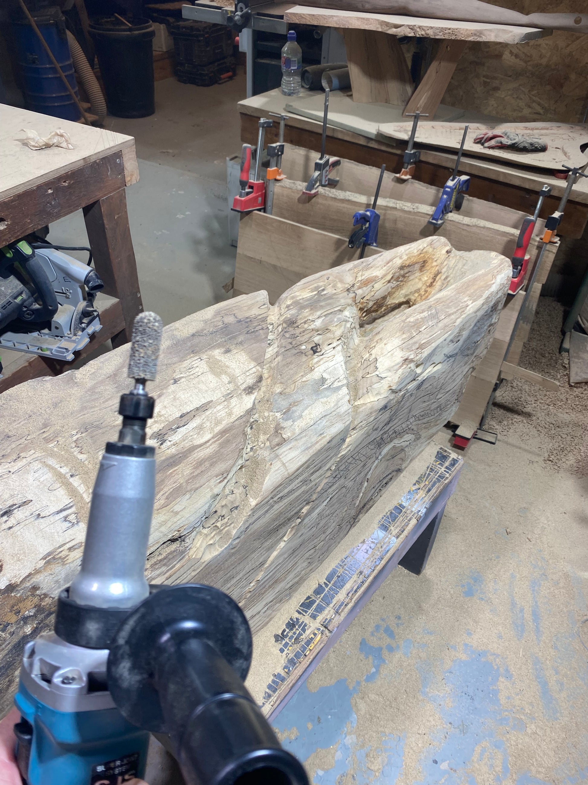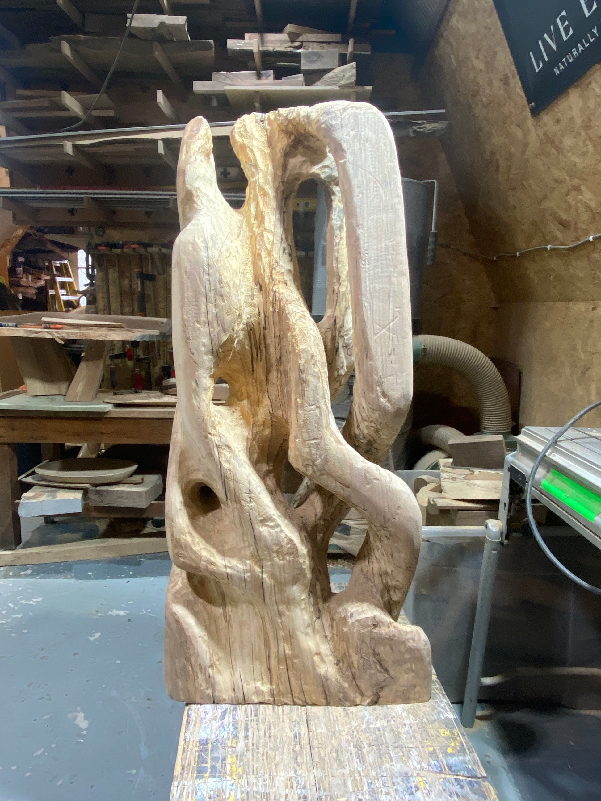 This is a unique piece carved from a large slab of Spalted Beech, positioned on a Black Walnut plinth.