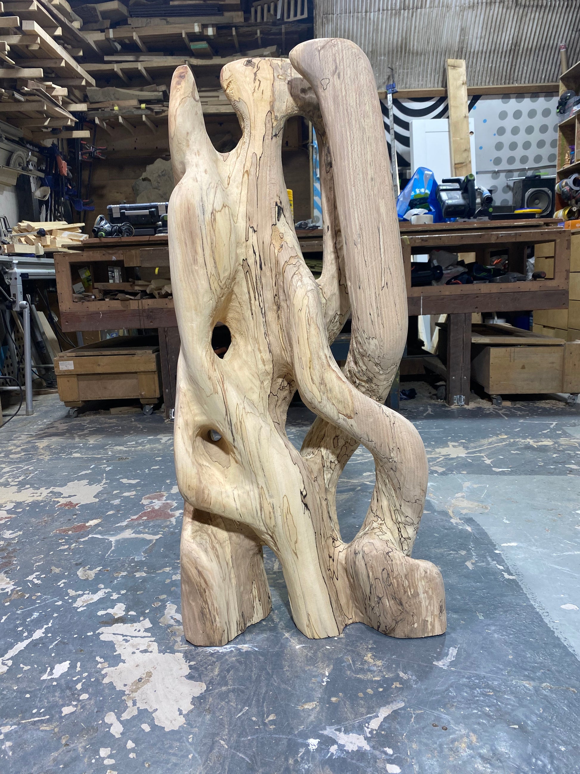 The Nomad is an intriguing sculpture that delves into the essence of nature’s form and aesthetics. Crafted from a solid Spalted Beech trunk, and resting on a Black Walnut plinth, this sculpture engages negative space to emphasize the smooth curves of its design. Shapes intertwine and connect, echoing the beauty of the natural world. This sculpture is the culmination of abstract thinking and unbridled freedom of expression. The artwork accentuates the detailed grain, with the raw essence of its inherent beauty.