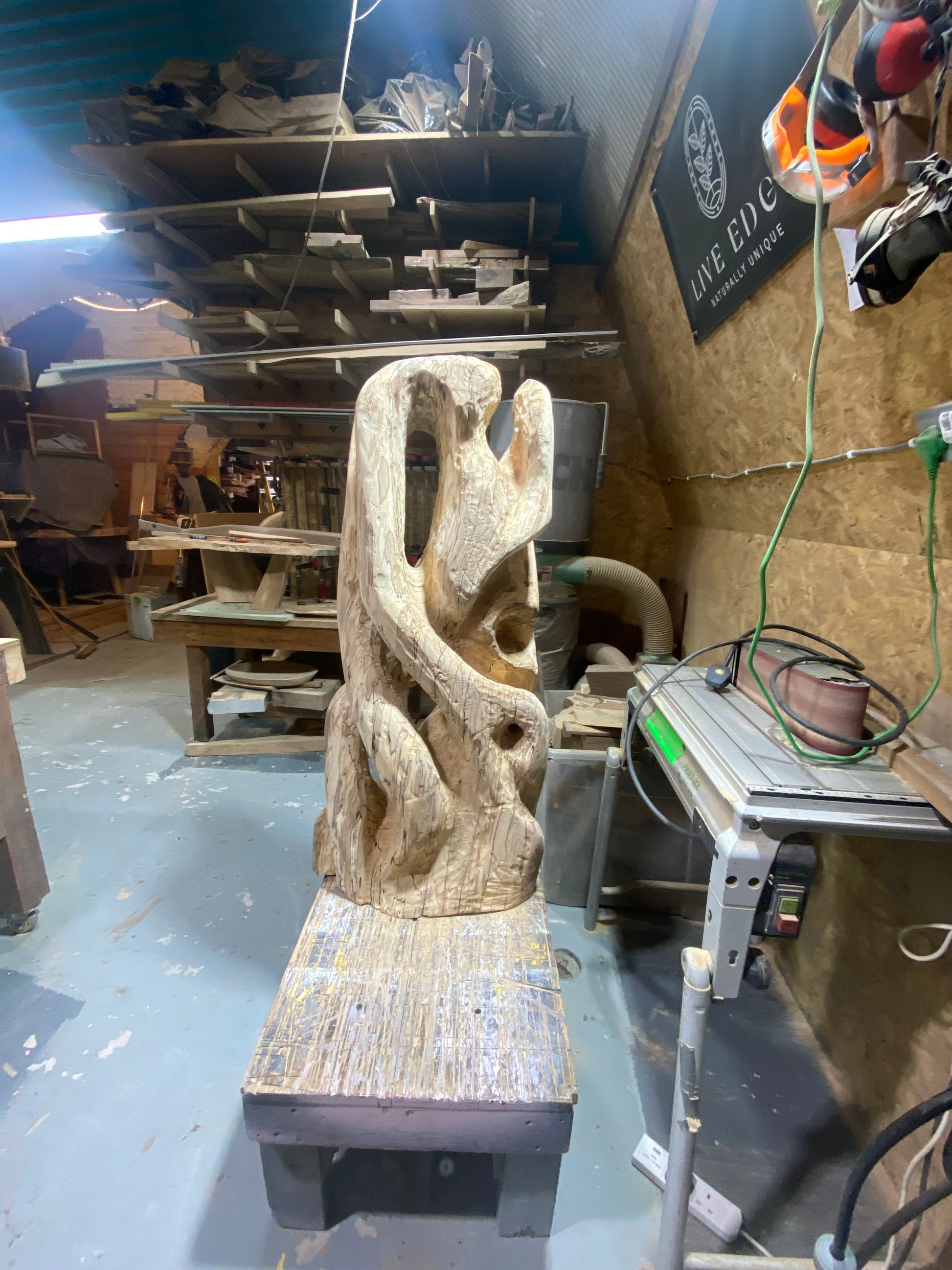 Delving into the intricate details of the carving process, from the power grinder's initial touch to smoothing with Japanese rasps and meticulous hand sanding. The Nomad, with its meandering form, is a testament to intuitive craftsmanship, letting the wood guide the creation of negative space in a dance of spontaneity and precision, without planning the form beforehand.